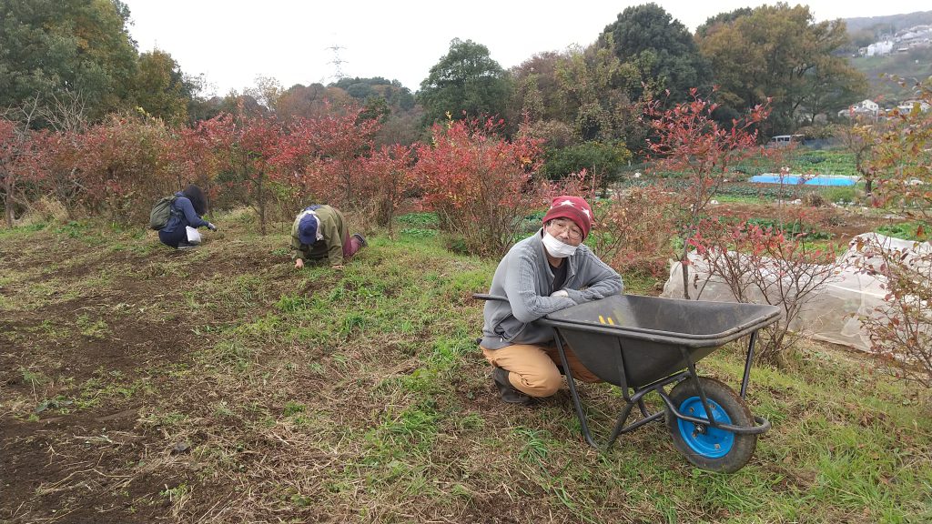 枯草を集める人、草を抜いている人、溜まった草達を畑の端に運ぶ人と。