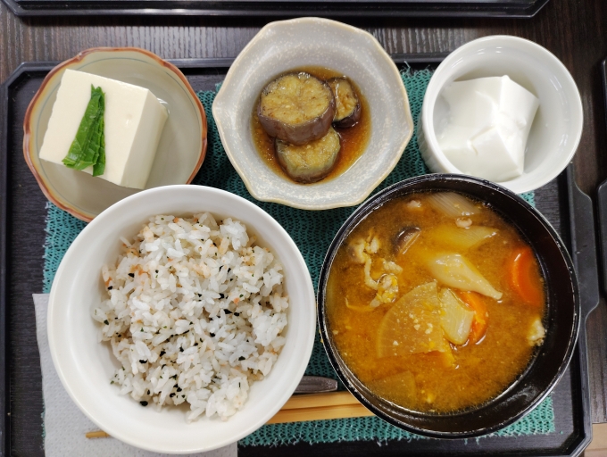 メニューは「カボチャの豚汁、ナスの揚げ浸し、鮭とわかめの御飯、冷や奴、杏仁豆腐」です。