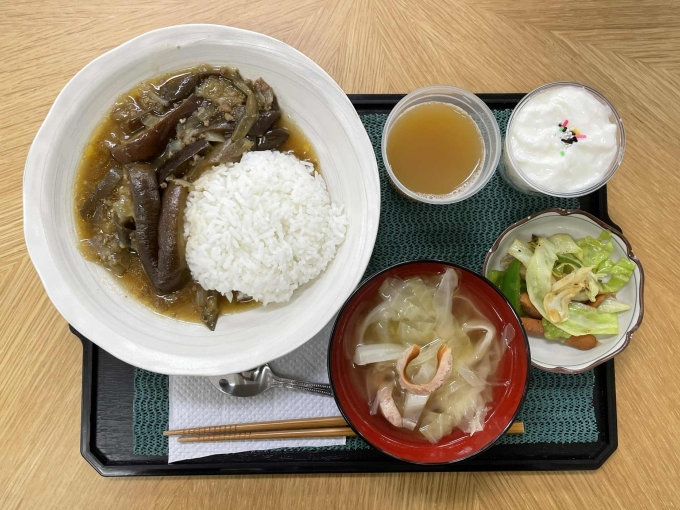 メニューは「麻婆茄子風、ピーマンとソーセージの炒め物、キャベツのスープ、バナナヨーグルト」です。