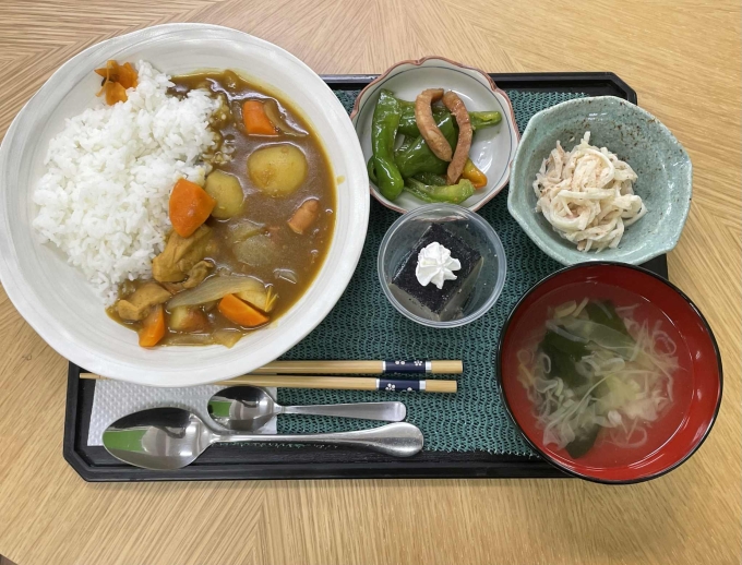 メニューは「チキンとソーセージのカレー、大根とツナのサラダ、ピーマンの炒め物、ネギとキャベツのスープ、黒ゴマ豆乳プリン」です。
