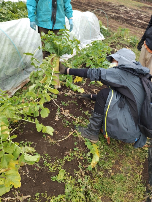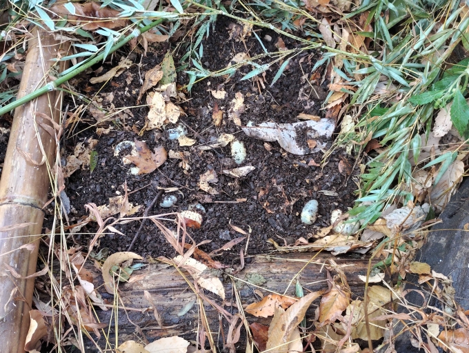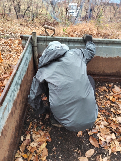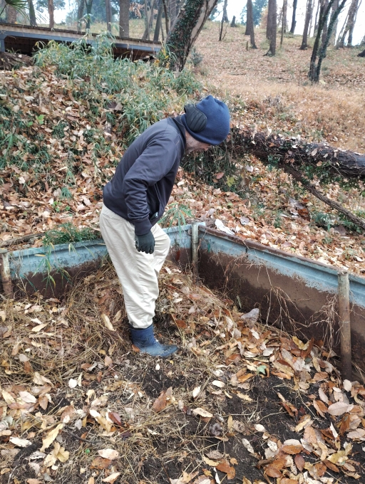 続いては、枯葉を敷き詰めていたところの土を腐葉土を作る場所にうつしていきます。