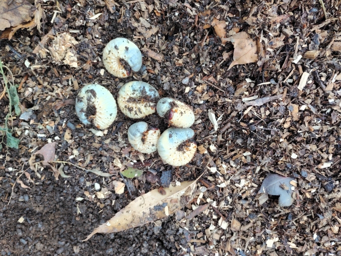 カブトムシの幼虫の糞が沢山あると、出てきます。一掘りで六匹がでてきたりしました。