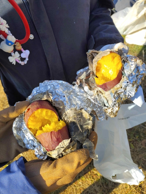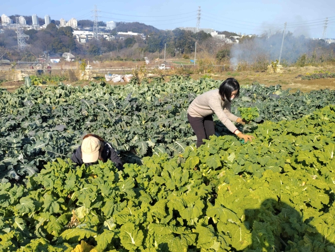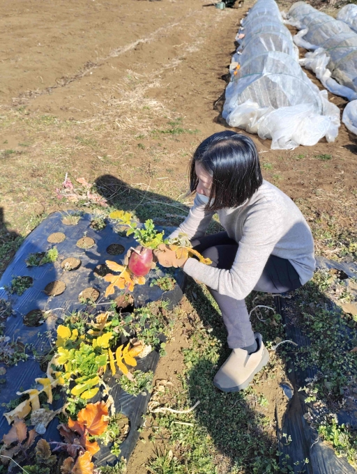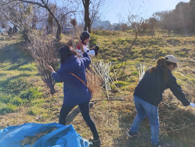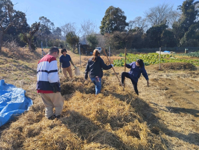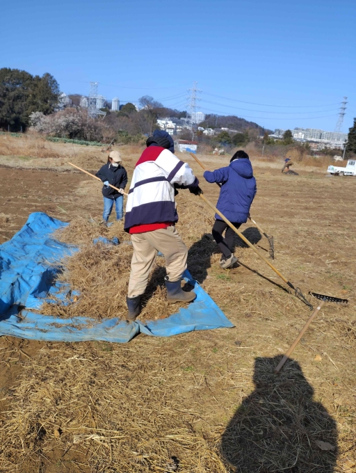 ブルーシートに雑草をレイキで集めて、作った場所に運んで米糠をまくを繰り返します。